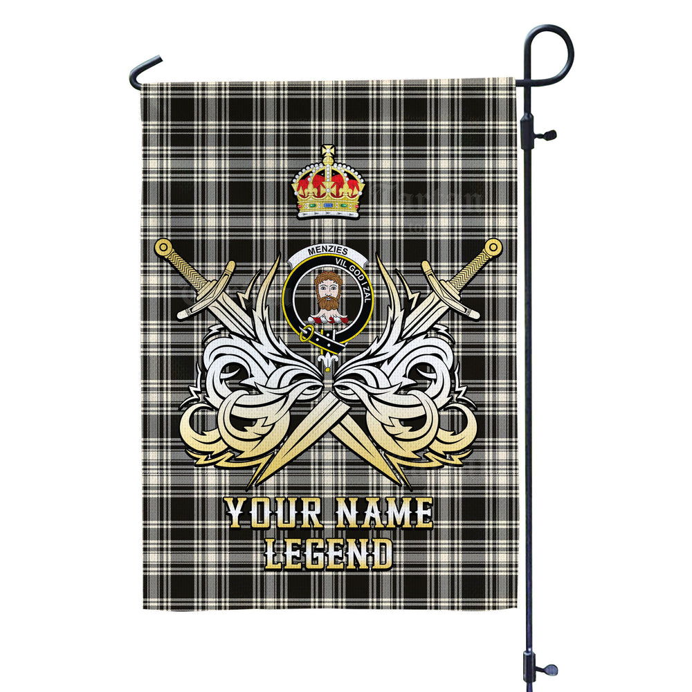 Custom Name Clan Menzies Black & White Ancient Tartan Garden Flag with Clan Crest and the Golden Sword of Courageous Legacy DP77