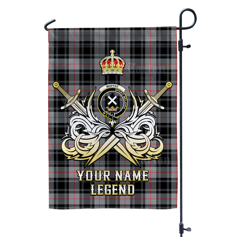 Custom Name Clan Moffat Modern Tartan Garden Flag with Clan Crest and the Golden Sword of Courageous Legacy VY36