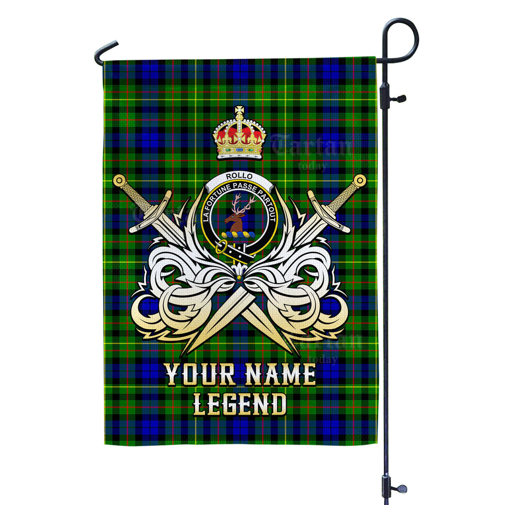 Custom Name Clan Rollo Tartan Garden Flag with Clan Crest and the Golden Sword of Courageous Legacy BT17