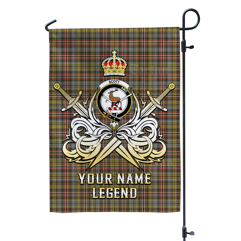 Custom Name Clan Scott Green Weathered Tartan Garden Flag with Clan Crest and the Golden Sword of Courageous Legacy KC17