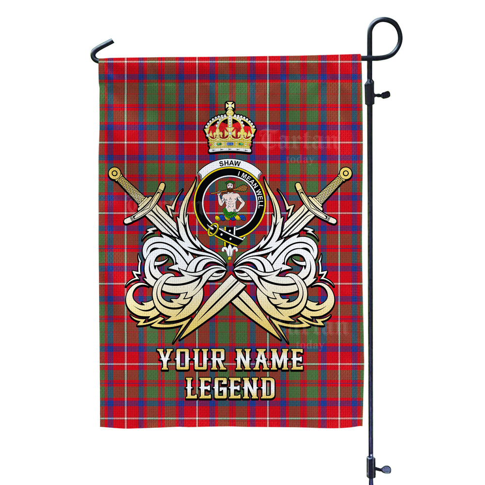 Custom Name Clan Shaw Red Modern Tartan Garden Flag with Clan Crest and the Golden Sword of Courageous Legacy KG74