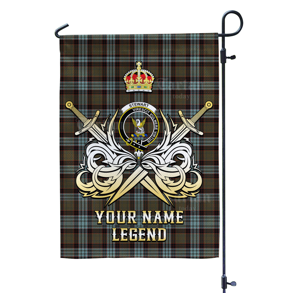 Custom Name Clan Stewart Old Weathered Tartan Garden Flag with Clan Crest and the Golden Sword of Courageous Legacy TE69