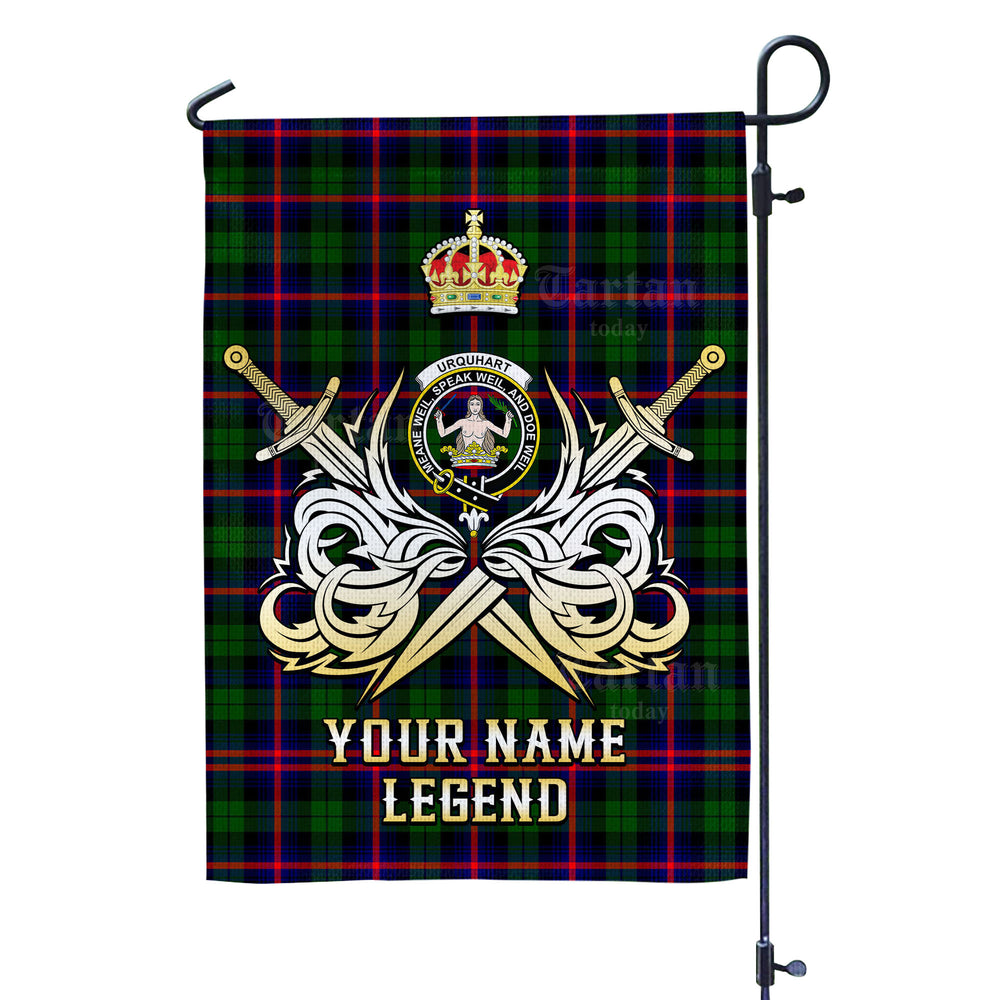 Custom Name Clan Urquhart Modern Tartan Garden Flag with Clan Crest and the Golden Sword of Courageous Legacy AB17